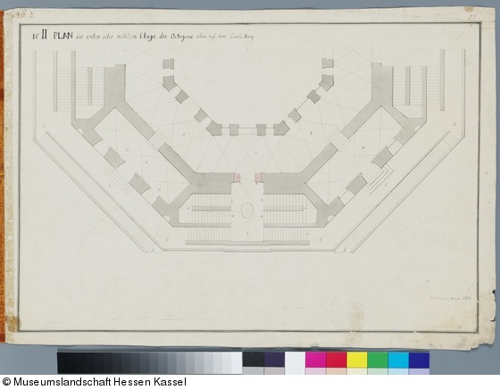 oben links: N° II PLAN der ersten oder mittlern Etage des Octogone oben auf dem Carls Berg (mit Feder in Braun);