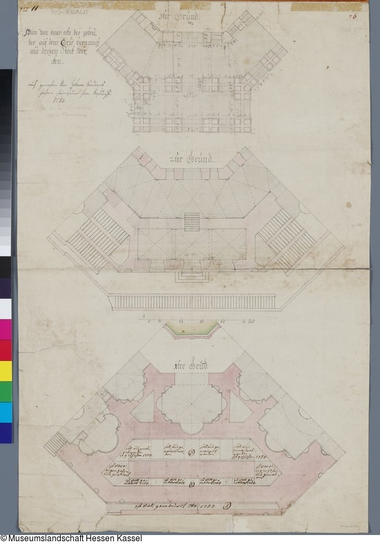 oben links: Plan von einer ecke des gebeü / des auf dem Carls berg nach / alle dreyen Stock Wer / cken (mit Feder in Braun); oben links: auf gemeßen von Johann Andreas / Feisten Steinhauer fon Roßkopf / 1753 (mit Feder in Braun);