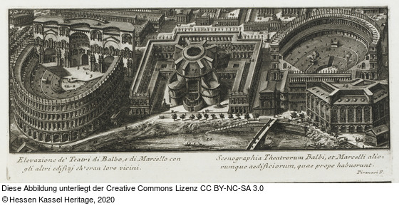 in der Platte (Druckgraphik): Tab. XLVIII. ... 13; Elevazione de' Teatri di Balbo, e di Marcello con gli altri edifizj ch' eran loro vicini. Scenographia Theatrorum Balbi, e Marcelli aliorumque aedificiorum, quae prope habuorunt.; Piranesi F.;