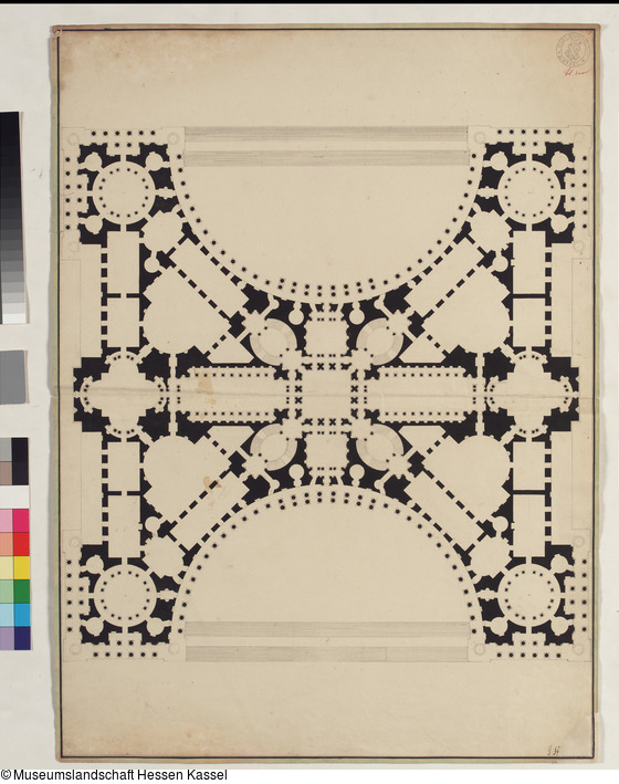 Der Grundriß ist eine nur in wenigen geringfügigen Einzelheiten abweichende Nachzeichnung nach dem Blatt von Simon Louis Du Ry, das ebenfalls in der Graphischen Sammlung aufbewahrt wird (L GS 12482). Du Rys Zeichnung entstand offensichtlich auf der Grundlage des bekannten Akademieentwurfs von Marie-Joseph Peyre, seinem Studienkollegen bei Jacques-François Blondel (zu Du Rys Blatt vgl. L GS 12482 sowie Boehlke 1958, S. 44 u. Dittscheid 1987, S. 13). Du Ry variierte dabei die Vorlage, indem er weniger und größere Raumkompartimente bildete und das Erscheinungsbild der konkav geschwungenen Kolonnade des Äußeren durch Verzicht auf die Mauerzungen vereinheitlichte.